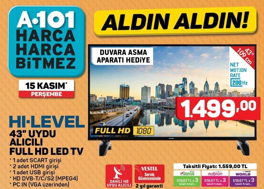 A101 HI-LEVEL full hd smart led tv Vestel servis güvencesi ve 2 yıl garantisi ile 1899 TL fiyatı ile 1 Ekim Perşembe tüm A101 market zincirlerinde.